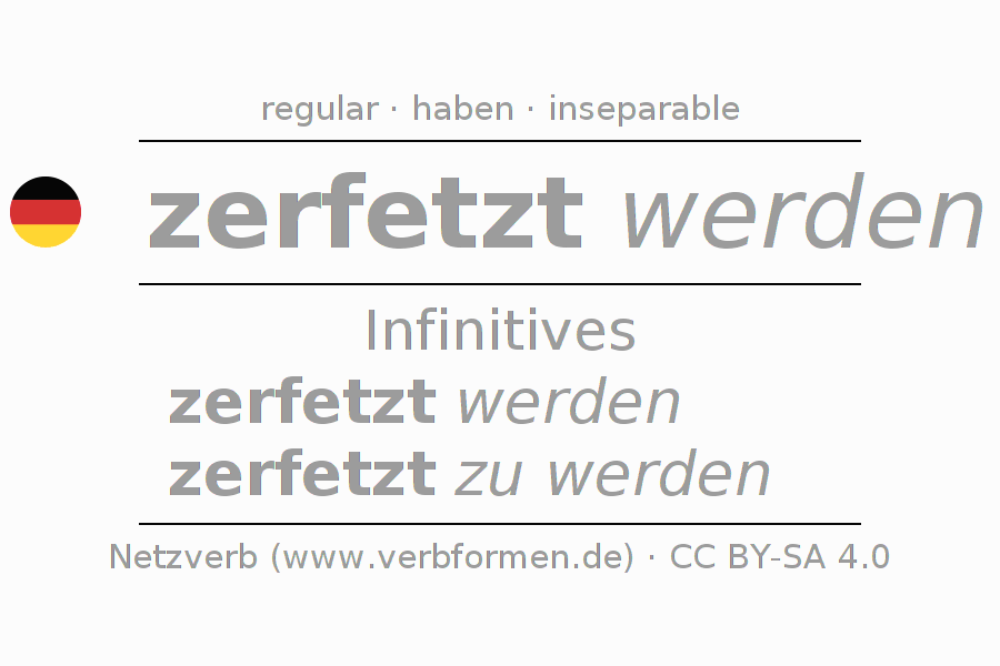 The conjugation of zerfetzen in Infinitive Present Perfect base form Passive is zerfetzt werden, zerfetzt zu werden.The conjugation corresponds to certain grammatical rules. Likewise the requirements for the conjugation of the simple verb forms of zerfetzen in Infinitive. Comments ☆