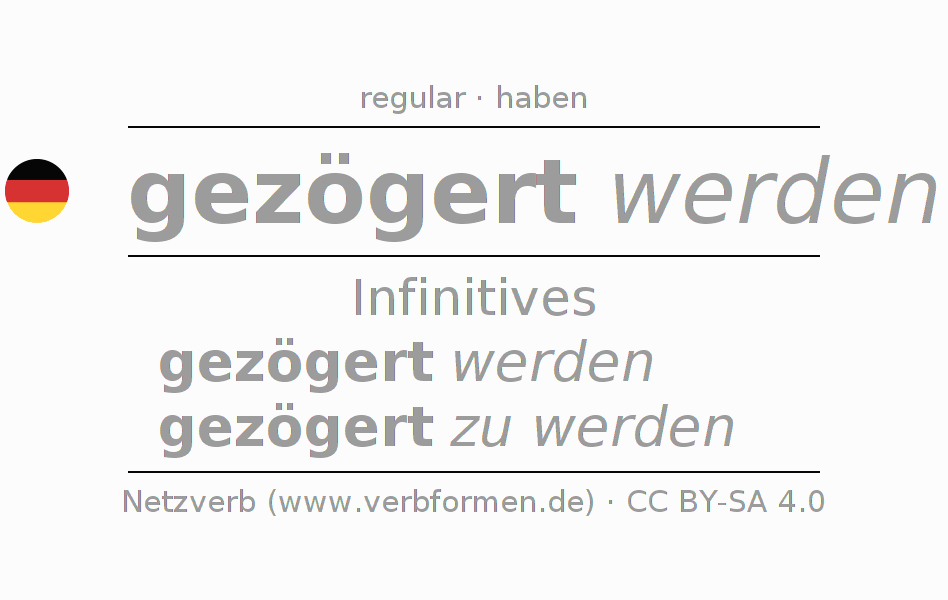 The conjugation of zögern in Infinitive Present Perfect base form Passive is gezögert werden, gezögert zu werden.The conjugation corresponds to certain grammatical rules. Likewise the requirements for the conjugation of the simple verb forms of zögern in Infinitive. Comments ☆