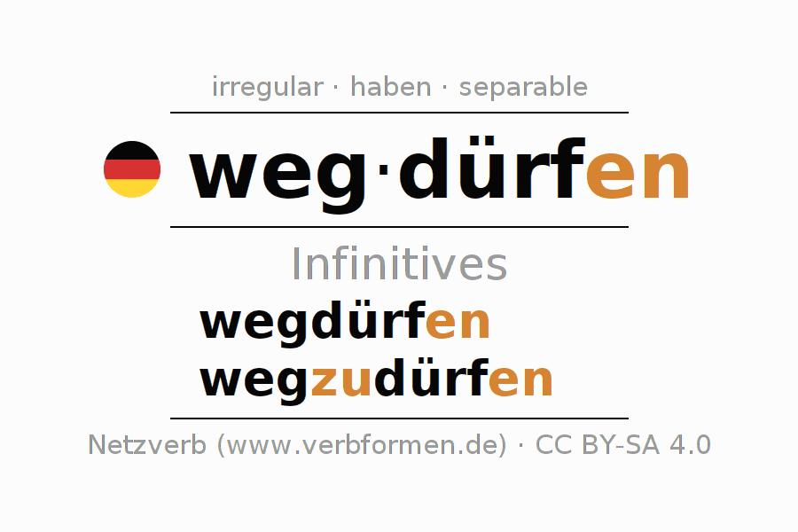 The infinitives of wegdürfen (allowed to leave, be discarded) are: wegdürfen, wegzudürfen. The ending -en is appended to the verb stem dürf. When forming the infinitive with zu the "zu" is inserted after the separable first part weg-. The formation of the forms corresponds to the grammatical rules for the conjugation of verbs in the infinitive. Comments ☆