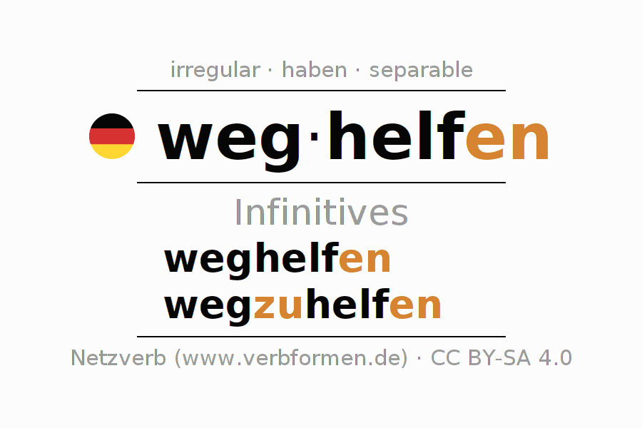The infinitives of weghelfen (help to get away, assist) are: weghelfen, wegzuhelfen. The ending -en is appended to the verb stem helf. When forming the infinitive with zu the "zu" is inserted after the separable first part weg-. The formation of the forms corresponds to the grammatical rules for the conjugation of verbs in the infinitive. Comments ☆