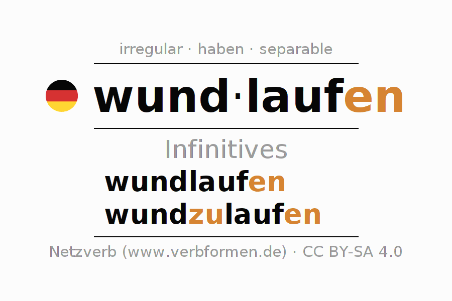 The infinitives of wundlaufen (get footsore, chafe) are: wundlaufen, wundzulaufen. The ending -en is appended to the verb stem lauf. When forming the infinitive with zu the "zu" is inserted after the separable first part wund-. The formation of the forms corresponds to the grammatical rules for the conjugation of verbs in the infinitive. Comments ☆