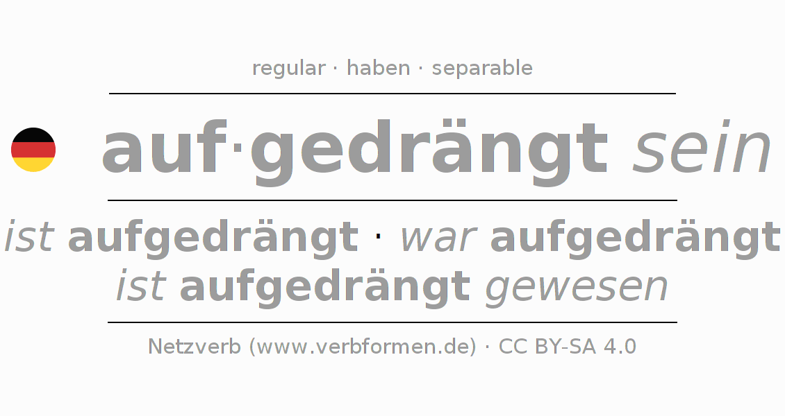 The conjugation of aufdrängen in Infinitive Present Perfect base form Statal Passive is aufgedrängt sein, aufgedrängt zu sein.The conjugation corresponds to certain grammatical rules. Likewise the requirements for the conjugation of the simple verb forms of aufdrängen in Infinitive. Comments ☆