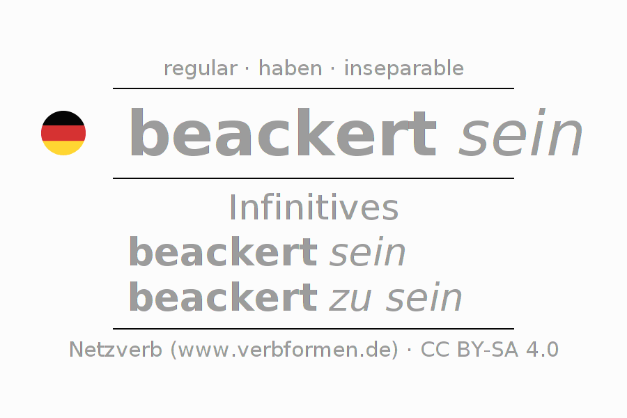 The conjugation of beackern in Infinitive Present Perfect base form Statal Passive is beackert sein, beackert zu sein.The conjugation corresponds to certain grammatical rules. Likewise the requirements for the conjugation of the simple verb forms of beackern in Infinitive. Comments ☆