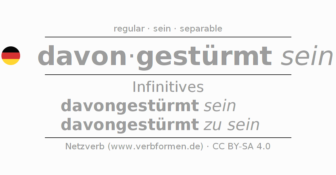 The conjugation of davonstürmen in Infinitive Present Perfect base form Statal Passive is davongestürmt sein, davongestürmt zu sein.The conjugation corresponds to certain grammatical rules. Likewise the requirements for the conjugation of the simple verb forms of davonstürmen in Infinitive. Comments ☆