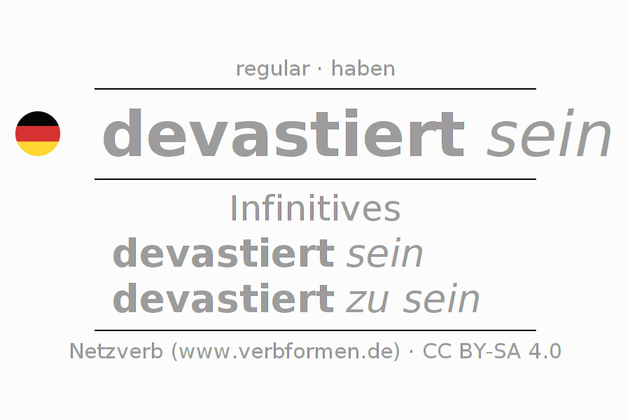 The conjugation of devastieren in Infinitive Present Perfect base form Statal Passive is devastiert sein, devastiert zu sein.The conjugation corresponds to certain grammatical rules. Likewise the requirements for the conjugation of the simple verb forms of devastieren in Infinitive. Comments ☆
