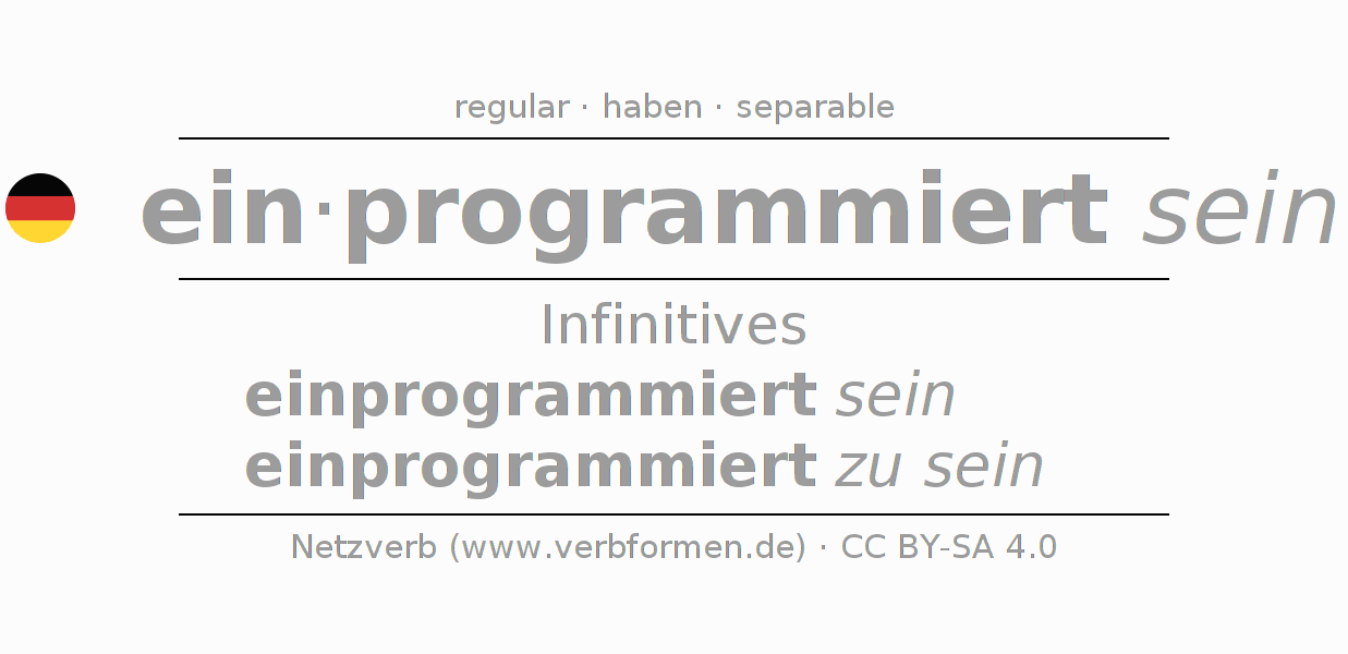 The verb einprogrammieren fully conjugated in all persons and numbers in the Infinitive Present Perfect