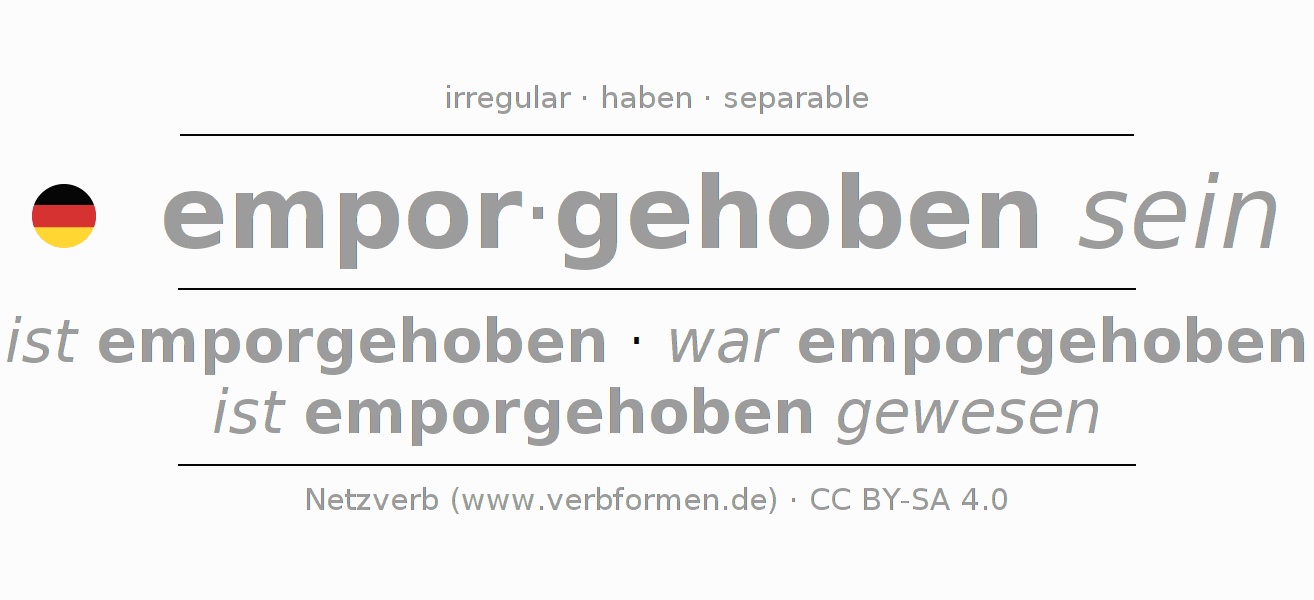 The conjugation of emporheben in Infinitive Present Perfect base form Statal Passive is emporgehoben sein, emporgehoben zu sein.The conjugation corresponds to certain grammatical rules. Likewise the requirements for the conjugation of the simple verb forms of emporheben in Infinitive. Comments ☆