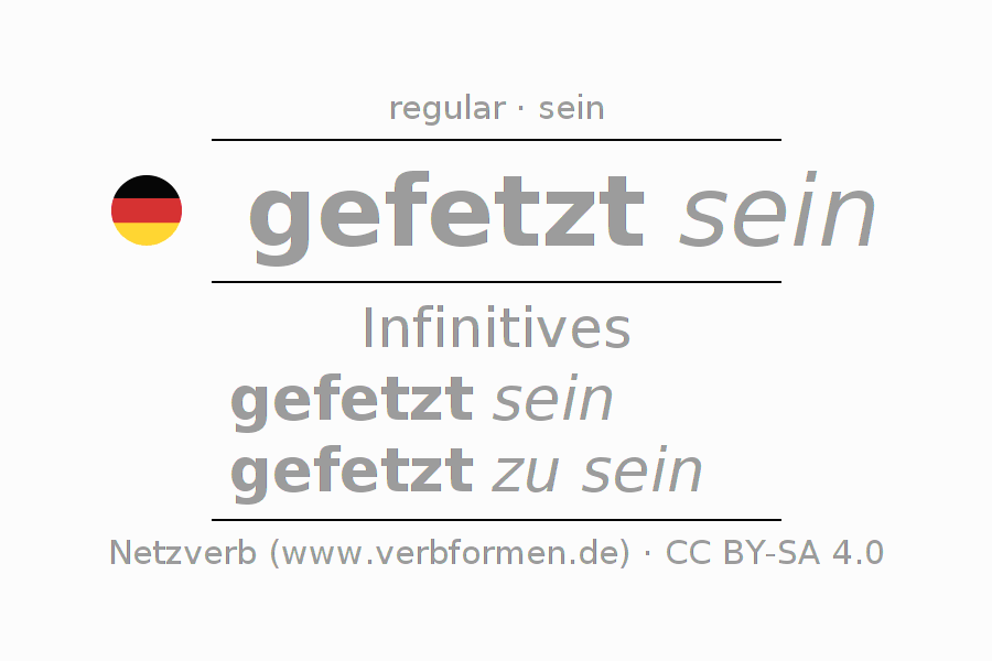 The conjugation of fetzen in Infinitive Present Perfect base form Statal Passive is gefetzt sein, gefetzt zu sein.The conjugation corresponds to certain grammatical rules. Likewise the requirements for the conjugation of the simple verb forms of fetzen in Infinitive. Comments ☆