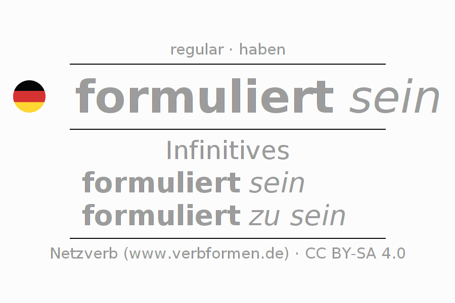 The conjugation of formulieren in Infinitive Present Perfect base form Statal Passive is formuliert sein, formuliert zu sein.The conjugation corresponds to certain grammatical rules. Likewise the requirements for the conjugation of the simple verb forms of formulieren in Infinitive. Comments ☆