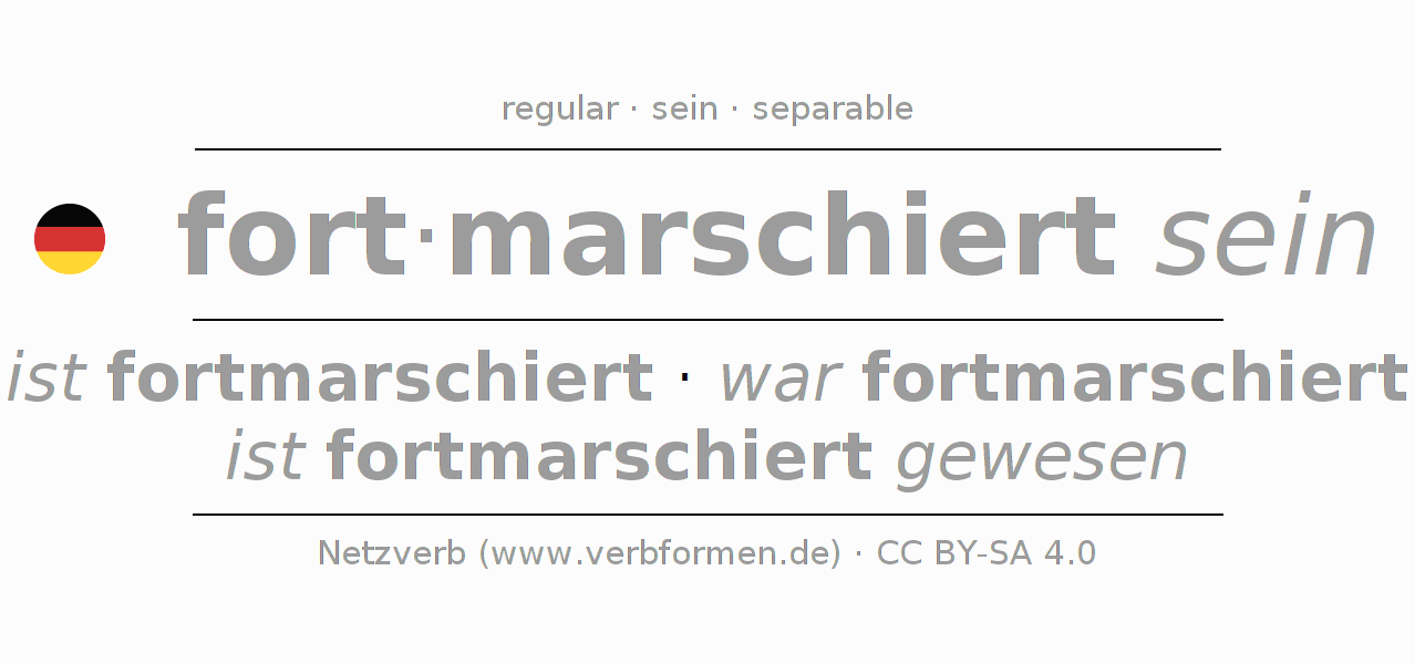 The conjugation of fortmarschieren in Infinitive Present Perfect base form Statal Passive is fortmarschiert sein, fortmarschiert zu sein.The conjugation corresponds to certain grammatical rules. Likewise the requirements for the conjugation of the simple verb forms of fortmarschieren in Infinitive. Comments ☆