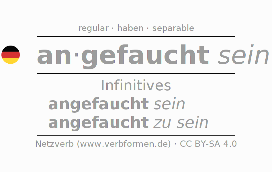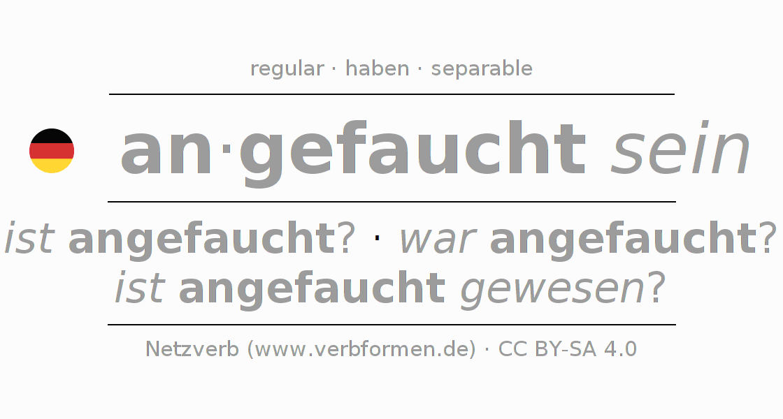 The conjugation of anfauchen in Infinitive Present Perfect base form Statal Passive is angefaucht sein, angefaucht zu sein.The conjugation corresponds to certain grammatical rules. Likewise the requirements for the conjugation of the simple verb forms of anfauchen in Infinitive. Comments ☆