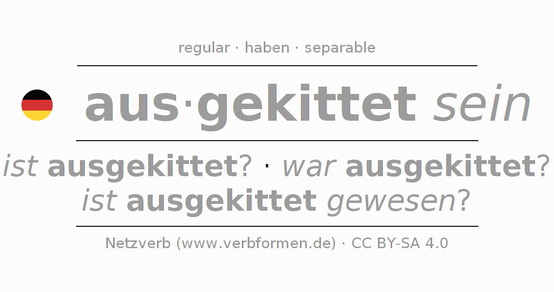 The conjugation of auskitten in Infinitive Present Perfect base form Statal Passive is ausgekittet sein, ausgekittet zu sein.The conjugation corresponds to certain grammatical rules. Likewise the requirements for the conjugation of the simple verb forms of auskitten in Infinitive. Comments ☆