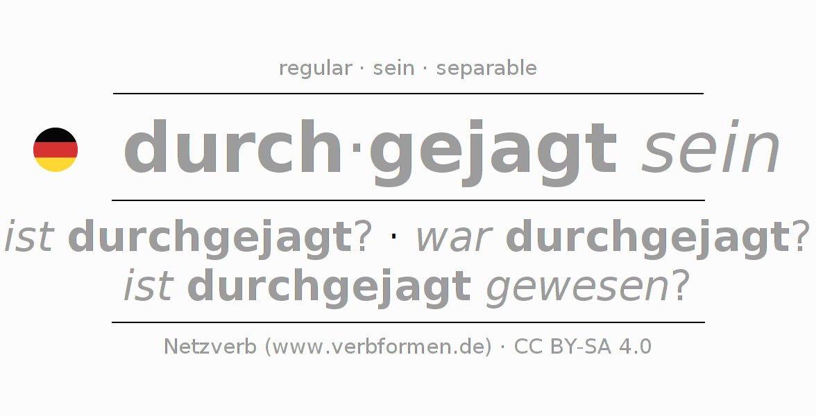The verb durch-jagen (ist) fully conjugated in all persons and numbers in the Infinitive Present Perfect