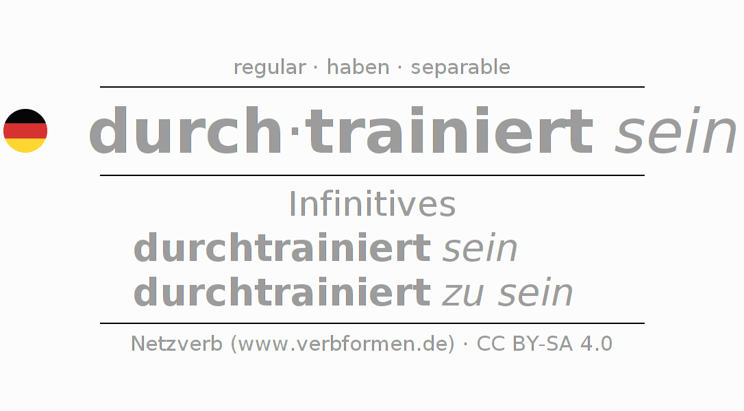 The conjugation of durchtrainieren in Infinitive Present Perfect base form Statal Passive is durchtrainiert sein, durchtrainiert zu sein.The conjugation corresponds to certain grammatical rules. Likewise the requirements for the conjugation of the simple verb forms of durchtrainieren in Infinitive. Comments ☆