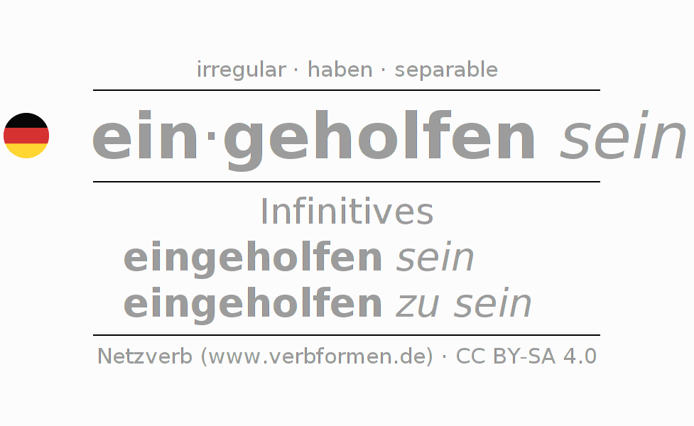 The conjugation of einhelfen in Infinitive Present Perfect base form Statal Passive is eingeholfen sein, eingeholfen zu sein.The conjugation corresponds to certain grammatical rules. Likewise the requirements for the conjugation of the simple verb forms of einhelfen in Infinitive. Comments ☆