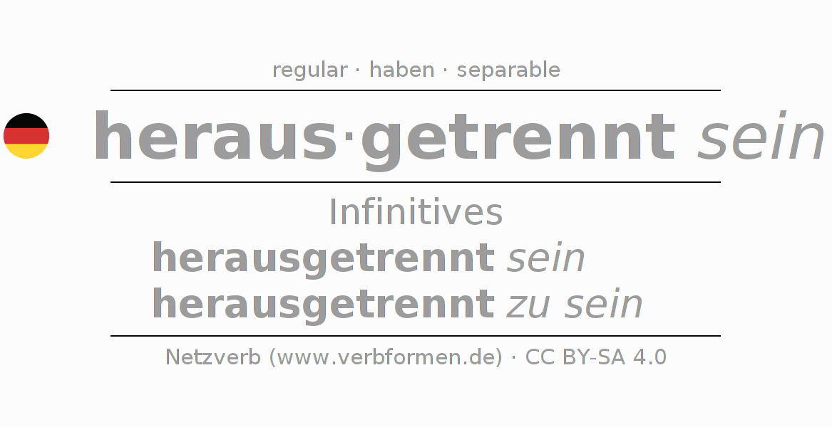The conjugation of heraustrennen in Infinitive Present Perfect base form Statal Passive is herausgetrennt sein, herausgetrennt zu sein.The conjugation corresponds to certain grammatical rules. Likewise the requirements for the conjugation of the simple verb forms of heraustrennen in Infinitive. Comments ☆