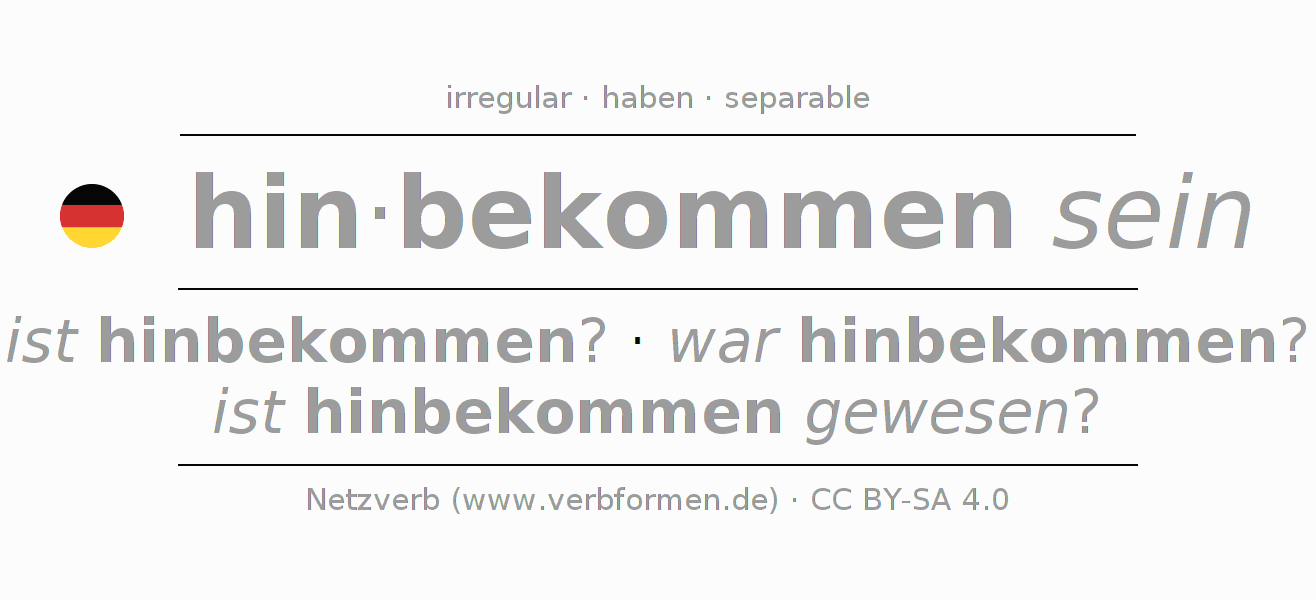 The conjugation of hinbekommen in Infinitive Present Perfect base form Statal Passive is hinbekommen sein, hinbekommen zu sein.The conjugation corresponds to certain grammatical rules. Likewise the requirements for the conjugation of the simple verb forms of hinbekommen in Infinitive. Comments ☆