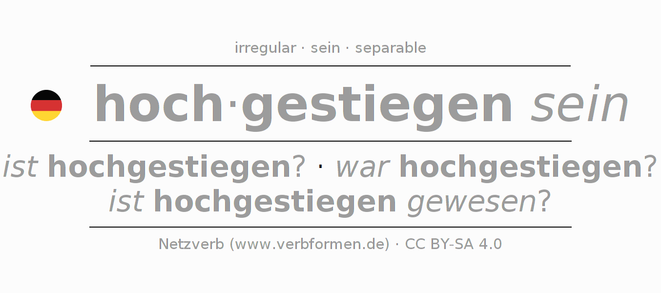 The conjugation of hochsteigen in Infinitive Present Perfect base form Statal Passive is hochgestiegen sein, hochgestiegen zu sein.The conjugation corresponds to certain grammatical rules. Likewise the requirements for the conjugation of the simple verb forms of hochsteigen in Infinitive. Comments ☆