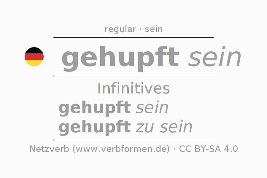 The conjugation of hupfen in Infinitive Present Perfect base form Statal Passive is gehupft sein, gehupft zu sein.The conjugation corresponds to certain grammatical rules. Likewise the requirements for the conjugation of the simple verb forms of hupfen in Infinitive. Comments ☆