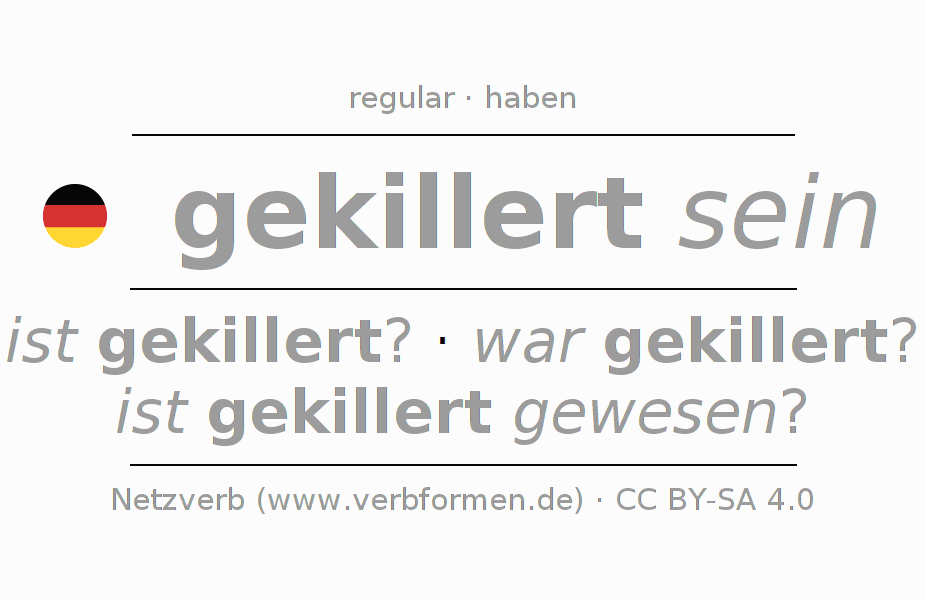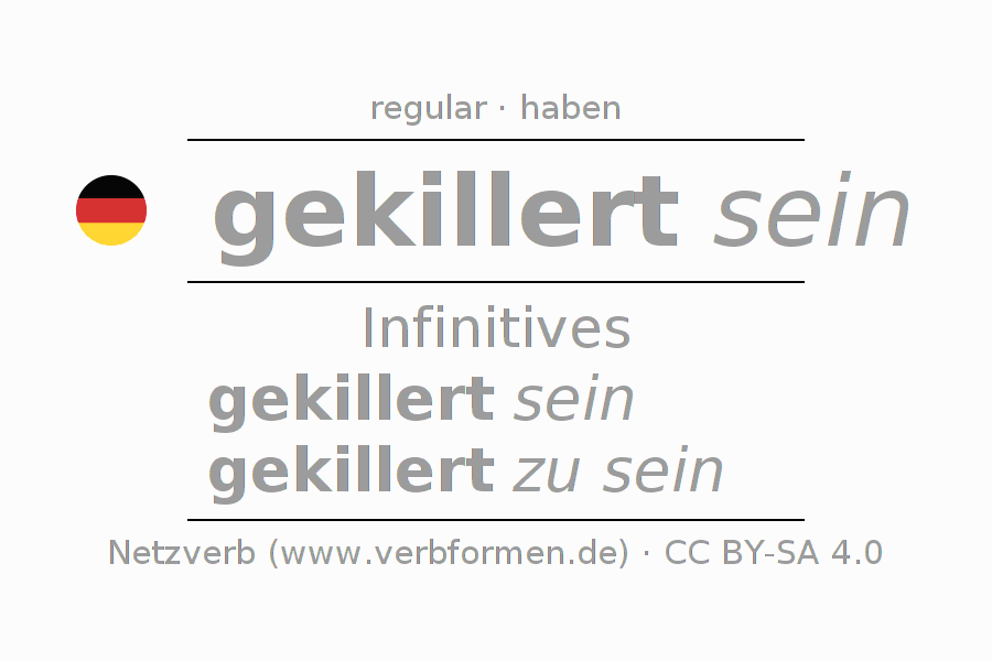 The conjugation of killern in Infinitive Present Perfect base form Statal Passive is gekillert sein, gekillert zu sein.The conjugation corresponds to certain grammatical rules. Likewise the requirements for the conjugation of the simple verb forms of killern in Infinitive. Comments ☆