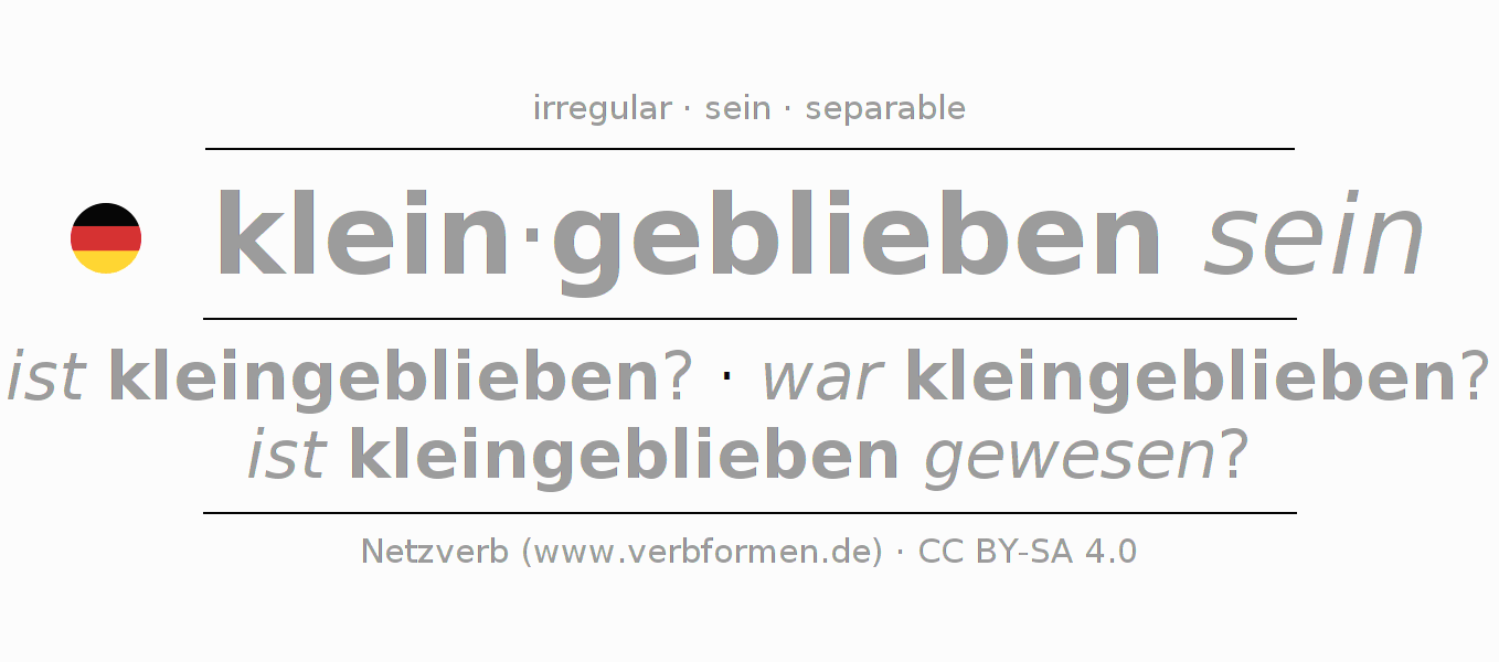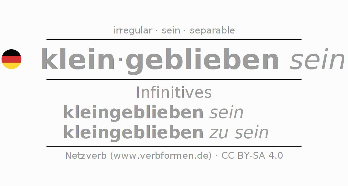 The conjugation of kleinbleiben in Infinitive Present Perfect base form Statal Passive is kleingeblieben sein, kleingeblieben zu sein.The conjugation corresponds to certain grammatical rules. Likewise the requirements for the conjugation of the simple verb forms of kleinbleiben in Infinitive. Comments ☆