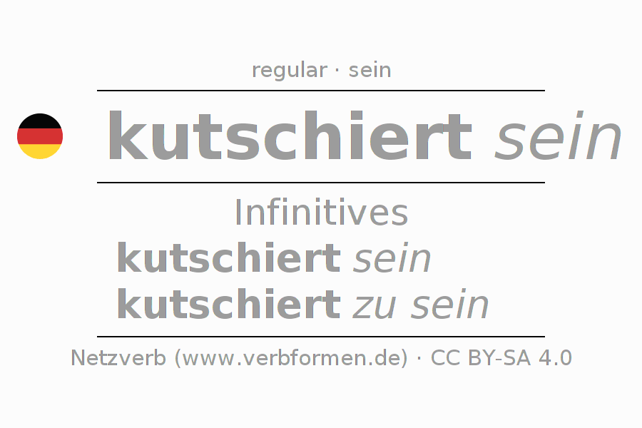 The conjugation of kutschieren in Infinitive Present Perfect base form Statal Passive is kutschiert sein, kutschiert zu sein.The conjugation corresponds to certain grammatical rules. Likewise the requirements for the conjugation of the simple verb forms of kutschieren in Infinitive. Comments ☆