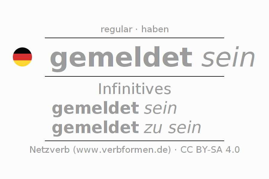 The conjugation of melden in Infinitive Present Perfect base form Statal Passive is gemeldet sein, gemeldet zu sein.The conjugation corresponds to certain grammatical rules. Likewise the requirements for the conjugation of the simple verb forms of melden in Infinitive. Comments ☆