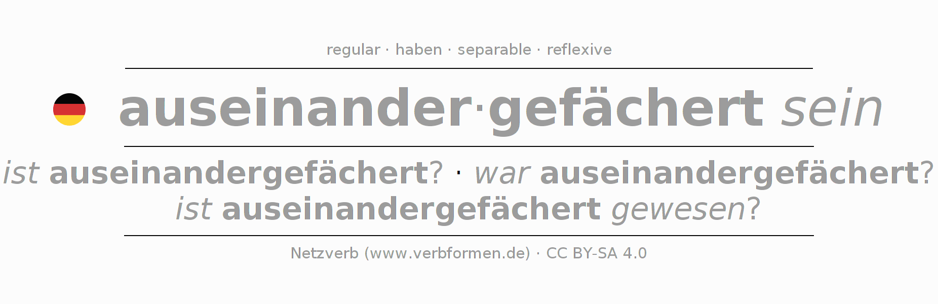 The verb sich auseinanderfächern fully conjugated in all persons and numbers in the Infinitive Present Perfect