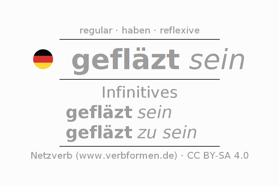 The conjugation of sich fläzen in Infinitive Present Perfect base form Statal Passive is gefläzt sein, gefläzt zu sein.The conjugation corresponds to certain grammatical rules. Likewise the requirements for the conjugation of the simple verb forms of fläzen in Infinitive. Comments ☆