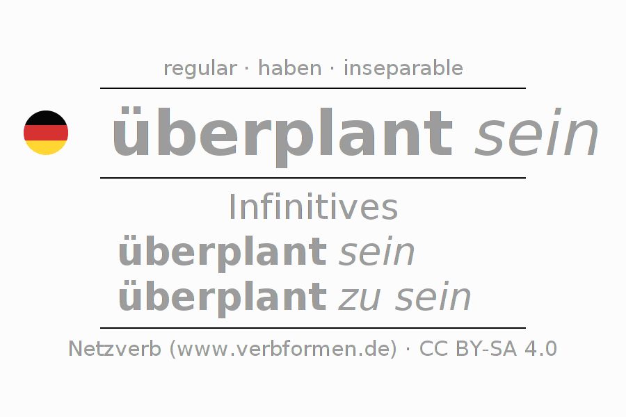 The conjugation of überplanen in Infinitive Present Perfect base form Statal Passive is überplant sein, überplant zu sein.The conjugation corresponds to certain grammatical rules. Likewise the requirements for the conjugation of the simple verb forms of überplanen in Infinitive. Comments ☆