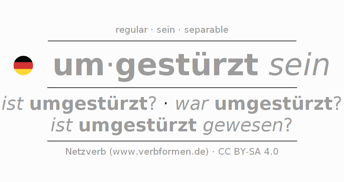 The conjugation of umstürzen in Infinitive Present Perfect base form Statal Passive is umgestürzt sein, umgestürzt zu sein.The conjugation corresponds to certain grammatical rules. Likewise the requirements for the conjugation of the simple verb forms of umstürzen in Infinitive. Comments ☆