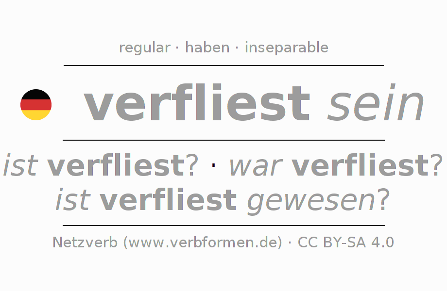 The conjugation of verfliesen in Infinitive Present Perfect base form Statal Passive is verfliest sein, verfliest zu sein.The conjugation corresponds to certain grammatical rules. Likewise the requirements for the conjugation of the simple verb forms of verfliesen in Infinitive. Comments ☆