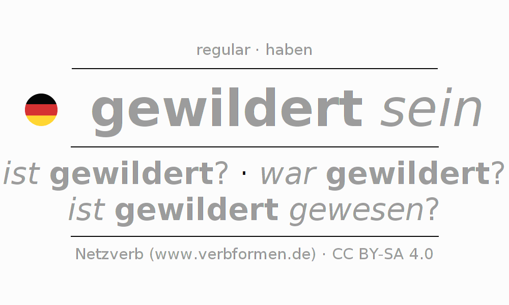 The conjugation of wildern in Infinitive Present Perfect base form Statal Passive is gewildert sein, gewildert zu sein.The conjugation corresponds to certain grammatical rules. Likewise the requirements for the conjugation of the simple verb forms of wildern in Infinitive. Comments ☆
