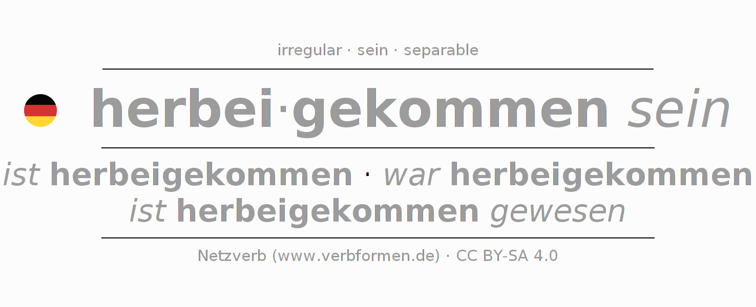The conjugation of herbeikommen in Infinitive Present Perfect base form Statal Passive is herbeigekommen sein, herbeigekommen zu sein.The conjugation corresponds to certain grammatical rules. Likewise the requirements for the conjugation of the simple verb forms of herbeikommen in Infinitive. Comments ☆