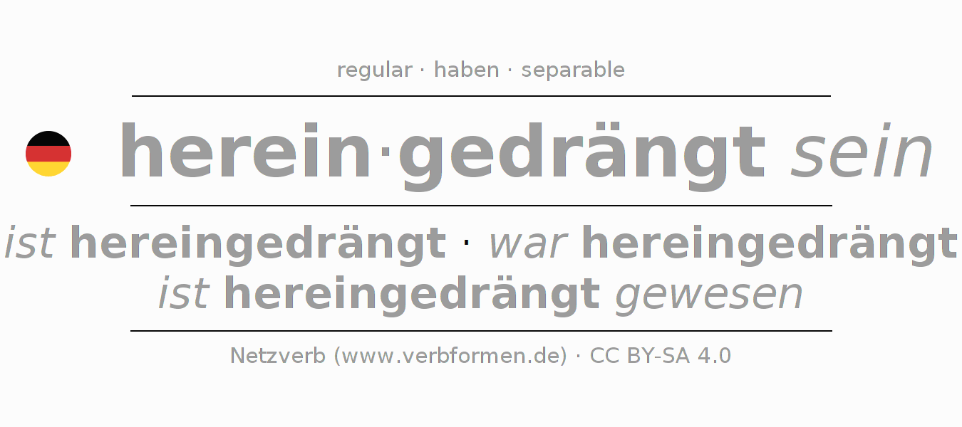 The conjugation of hereindrängen in Infinitive Present Perfect base form Statal Passive is hereingedrängt sein, hereingedrängt zu sein.The conjugation corresponds to certain grammatical rules. Likewise the requirements for the conjugation of the simple verb forms of hereindrängen in Infinitive. Comments ☆