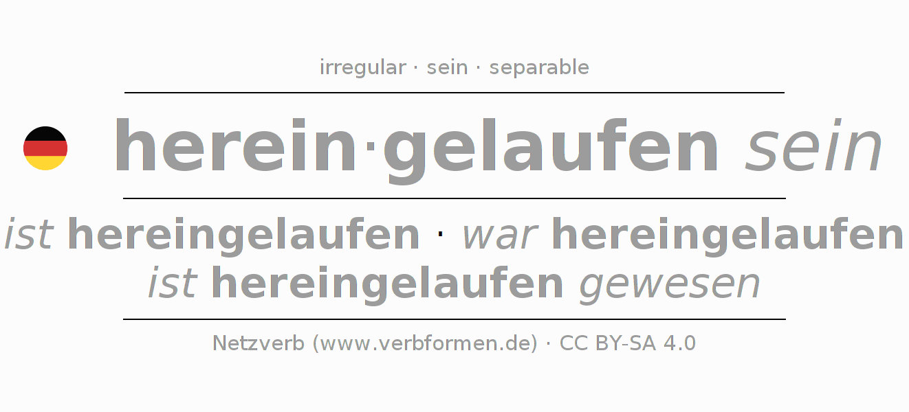 The conjugation of hereinlaufen in Infinitive Present Perfect base form Statal Passive is hereingelaufen sein, hereingelaufen zu sein.The conjugation corresponds to certain grammatical rules. Likewise the requirements for the conjugation of the simple verb forms of hereinlaufen in Infinitive. Comments ☆