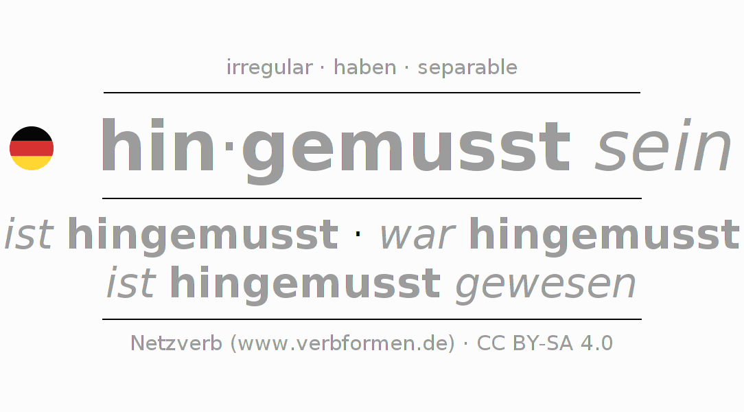 The conjugation of hinmüssen in Infinitive Present Perfect base form Statal Passive is hingemusst sein, hingemusst zu sein.The conjugation corresponds to certain grammatical rules. Likewise the requirements for the conjugation of the simple verb forms of hinmüssen in Infinitive. Comments ☆