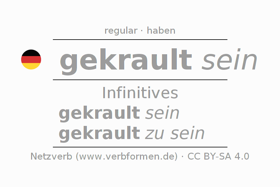 The conjugation of kraulen in Infinitive Present Perfect base form Statal Passive is gekrault sein, gekrault zu sein.The conjugation corresponds to certain grammatical rules. Likewise the requirements for the conjugation of the simple verb forms of kraulen in Infinitive. Comments ☆