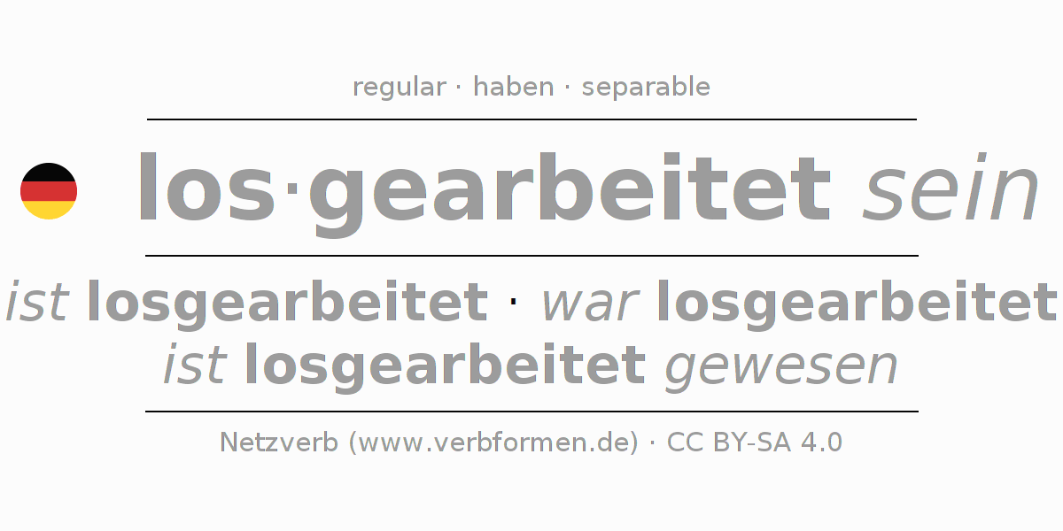 The conjugation of losarbeiten in Infinitive Present Perfect base form Statal Passive is losgearbeitet sein, losgearbeitet zu sein.The conjugation corresponds to certain grammatical rules. Likewise the requirements for the conjugation of the simple verb forms of losarbeiten in Infinitive. Comments ☆