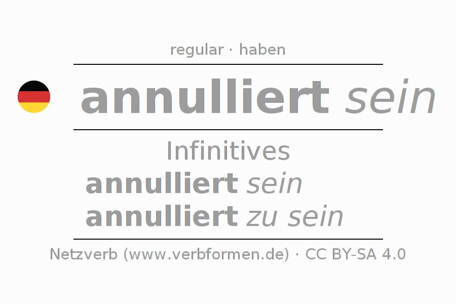 The conjugation of annullieren in Infinitive Present Perfect base form Statal Passive is annulliert sein, annulliert zu sein.The conjugation corresponds to certain grammatical rules. Likewise the requirements for the conjugation of the simple verb forms of annullieren in Infinitive. Comments ☆