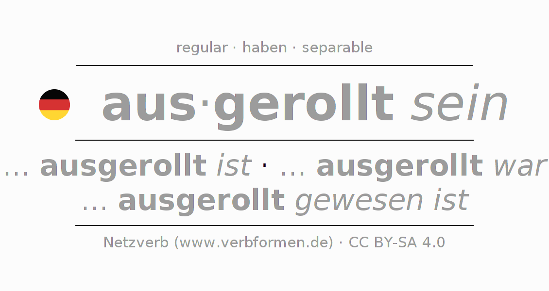 The conjugation of ausrollen in Infinitive Present Perfect base form Statal Passive is ausgerollt sein, ausgerollt zu sein.The conjugation corresponds to certain grammatical rules. Likewise the requirements for the conjugation of the simple verb forms of ausrollen in Infinitive. Comments ☆