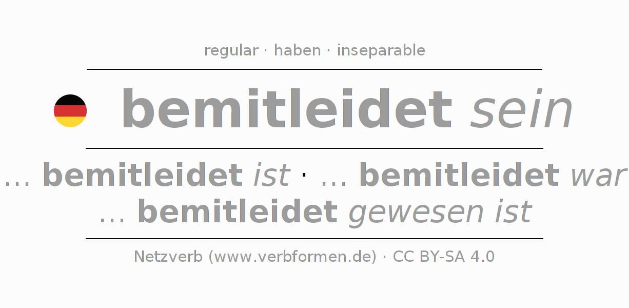 The conjugation of bemitleiden in Infinitive Present Perfect base form Statal Passive is bemitleidet sein, bemitleidet zu sein.The conjugation corresponds to certain grammatical rules. Likewise the requirements for the conjugation of the simple verb forms of bemitleiden in Infinitive. Comments ☆