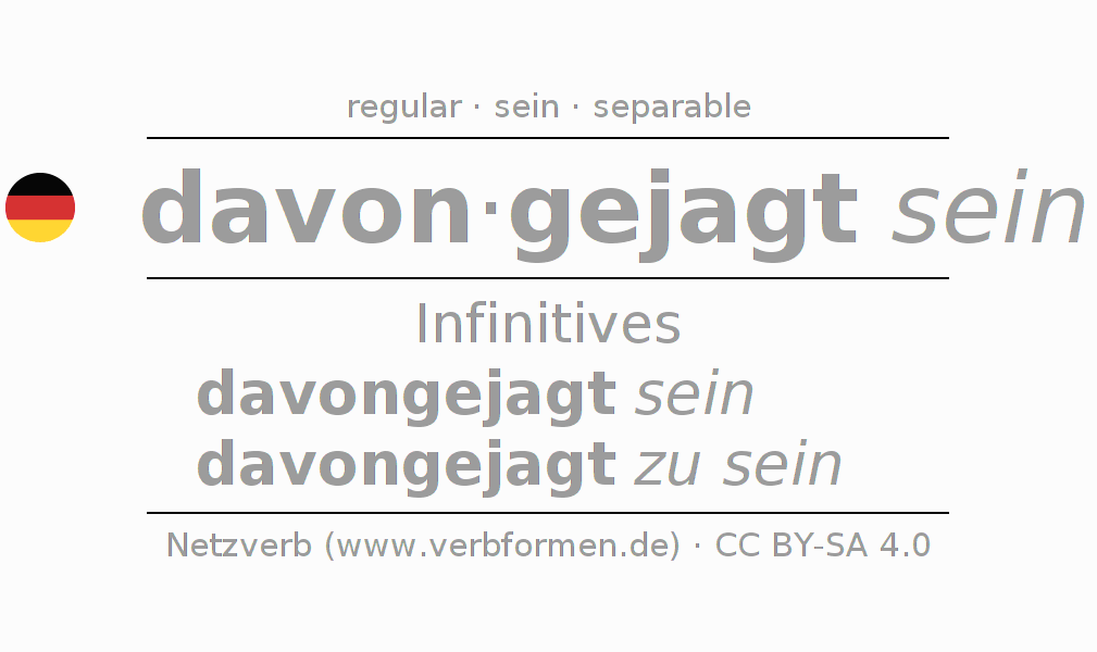 The conjugation of davonjagen in Infinitive Present Perfect base form Statal Passive is davongejagt sein, davongejagt zu sein.The conjugation corresponds to certain grammatical rules. Likewise the requirements for the conjugation of the simple verb forms of davonjagen in Infinitive. Comments ☆