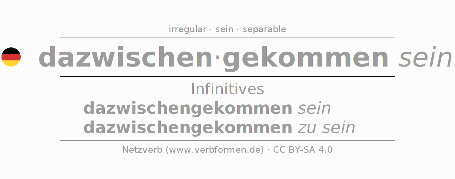 The verb dazwischenkommen fully conjugated in all persons and numbers in the Infinitive Present Perfect
