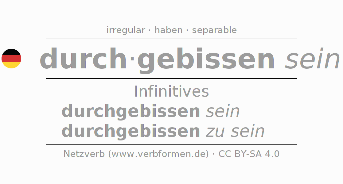 The conjugation of durchbeißen in Infinitive Present Perfect base form Statal Passive is durchgebissen sein, durchgebissen zu sein.The conjugation corresponds to certain grammatical rules. Likewise the requirements for the conjugation of the simple verb forms of durchbeißen in Infinitive. Comments ☆