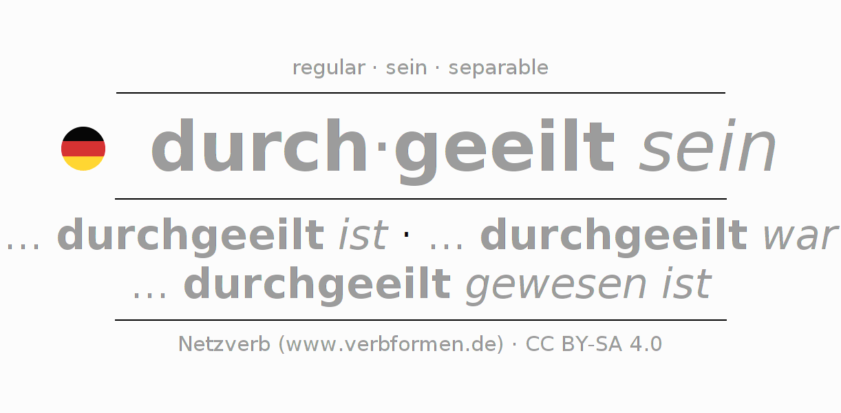 The conjugation of durcheilen in Infinitive Present Perfect base form Statal Passive is durchgeeilt sein, durchgeeilt zu sein.The conjugation corresponds to certain grammatical rules. Likewise the requirements for the conjugation of the simple verb forms of durcheilen in Infinitive. Comments ☆
