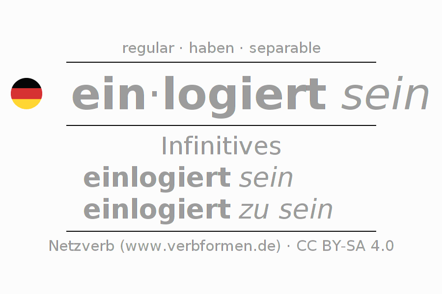 The conjugation of einlogieren in Infinitive Present Perfect base form Statal Passive is einlogiert sein, einlogiert zu sein.The conjugation corresponds to certain grammatical rules. Likewise the requirements for the conjugation of the simple verb forms of einlogieren in Infinitive. Comments ☆