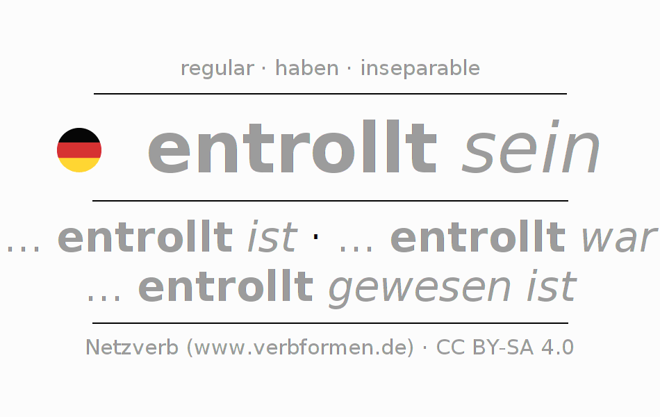 The conjugation of entrollen in Infinitive Present Perfect base form Statal Passive is entrollt sein, entrollt zu sein.The conjugation corresponds to certain grammatical rules. Likewise the requirements for the conjugation of the simple verb forms of entrollen in Infinitive. Comments ☆