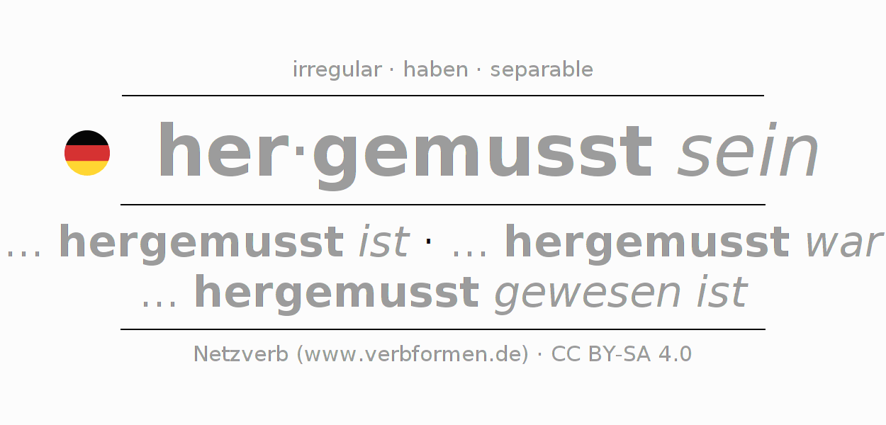 The conjugation of hermüssen in Infinitive Present Perfect base form Statal Passive is hergemusst sein, hergemusst zu sein.The conjugation corresponds to certain grammatical rules. Likewise the requirements for the conjugation of the simple verb forms of hermüssen in Infinitive. Comments ☆