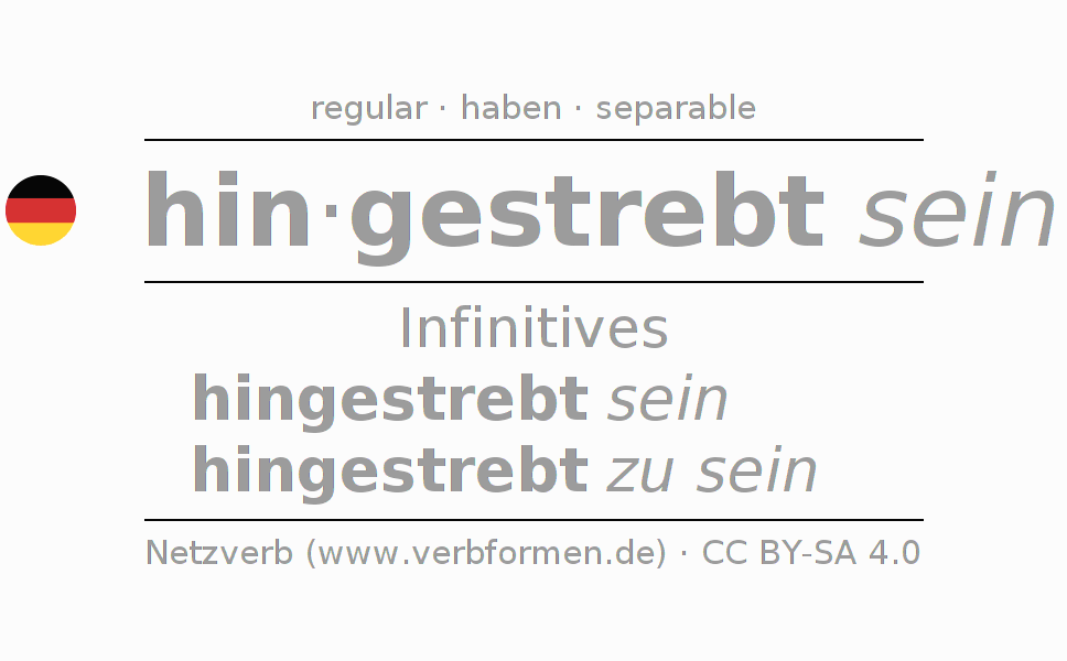 The conjugation of hinstreben in Infinitive Present Perfect base form Statal Passive is hingestrebt sein, hingestrebt zu sein.The conjugation corresponds to certain grammatical rules. Likewise the requirements for the conjugation of the simple verb forms of hinstreben in Infinitive. Comments ☆